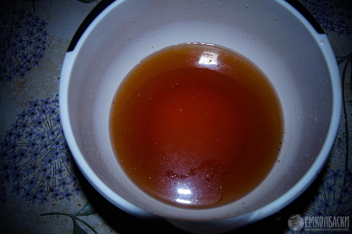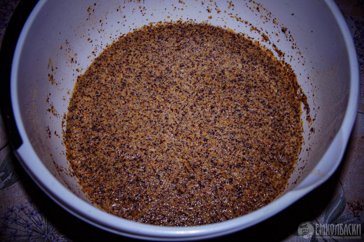 В измельчёные горчичные зёрна влить рассол и перемешать.