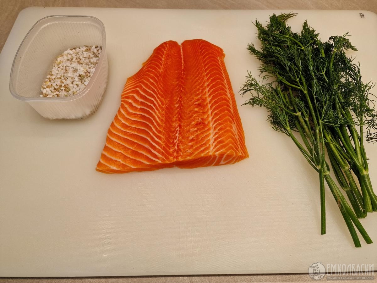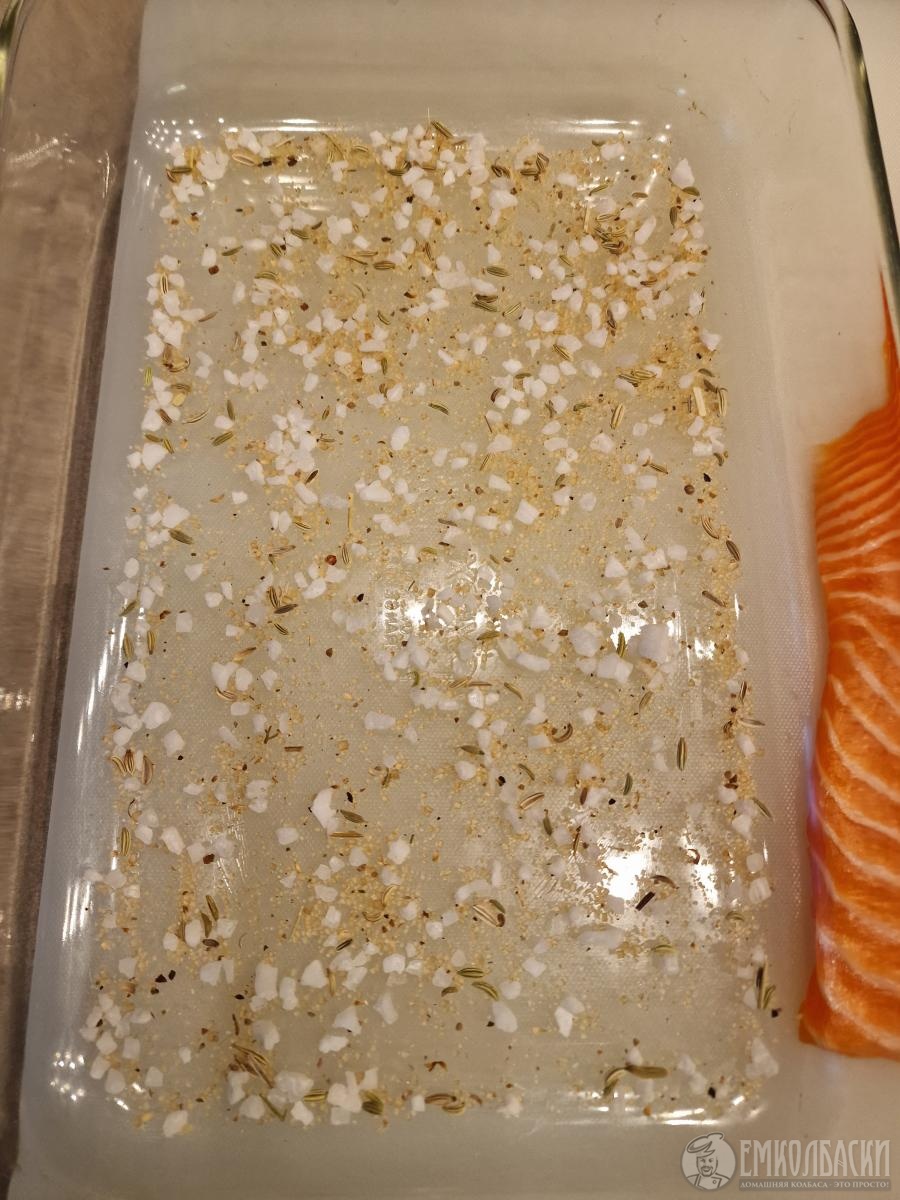 Посолочная смесь из расчета на примерно 800гр филе: 35гр крупной морской соли, 15гр тростникового сахара, 1 средняя горошина душистого перца, смолоть, 0.5гр молотого кориандра и 1гр семян фенхеля (специи можно не добавлять, ограничившись смесью соли и сахара, либо добавлять их на ваш вкус)