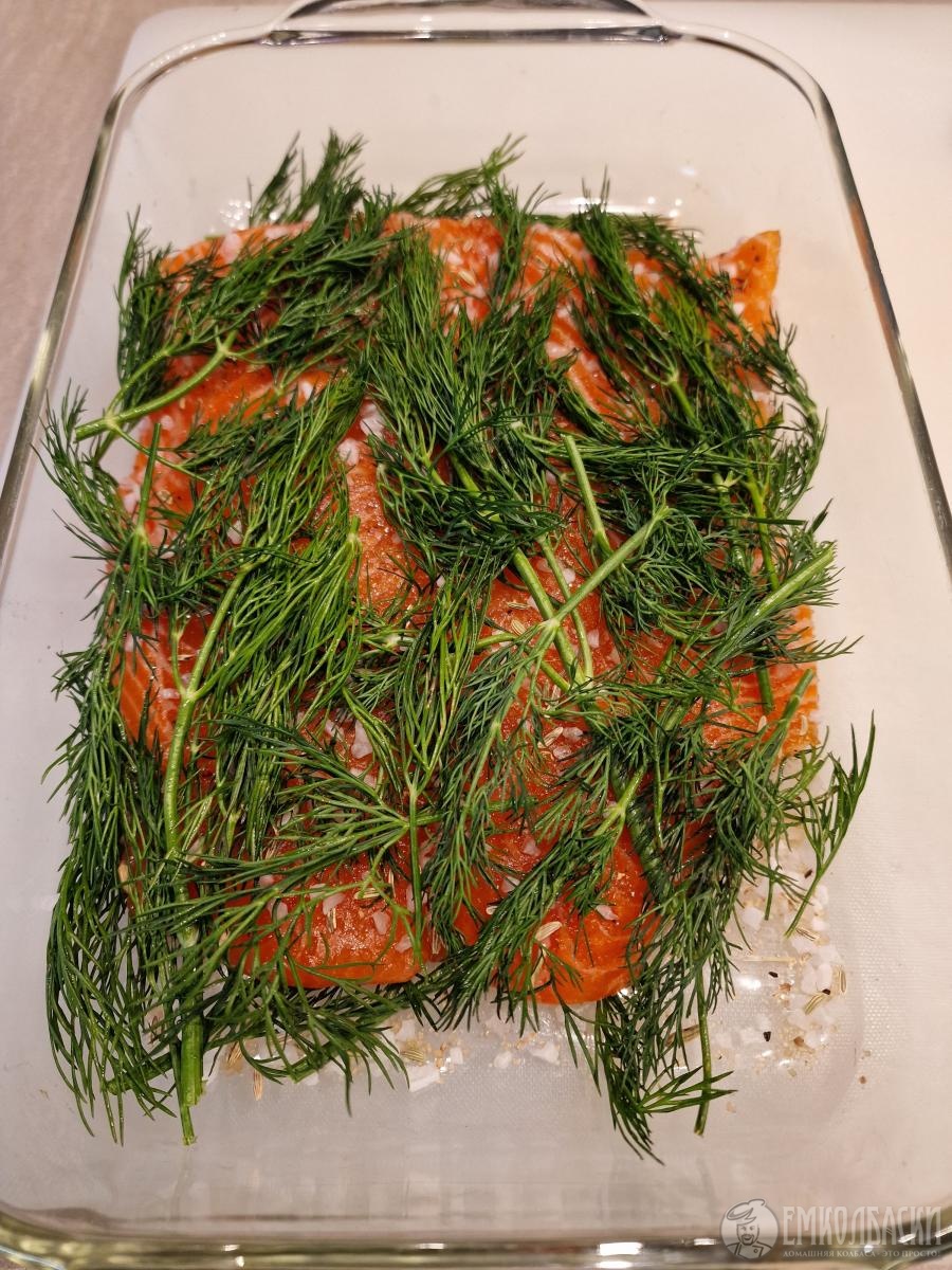Способ засолки: посыпать дно тары, где будет происходить засолка, половиной смеси, филе форели промокнуть слегка салфеткой с двух сторон, выложить на посолочную смесь, сверху присыпать филе оставшейся смесью, чуть-чуть придавить, аккуратно вынуть из тары, положить прямо на оставшиеся специи на дне тары много укропа, на укроп обратно положить филе и сверху филе тоже выложить укроп, закрыть фольгой и убрать в поддон хол-ка часов на 10-12, не больше; после достать, хорошо промыть холодной водой - тереть ничего не надо, но нужно смыть всю оставшуюся соль, далее хорошо промокнуть салфетками, после чего завернуть в пищевую пленку в один слой и часов на 12 убрать обратно в хол-к, после можно дегустировать