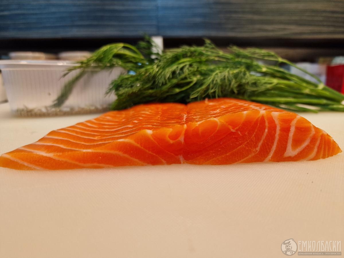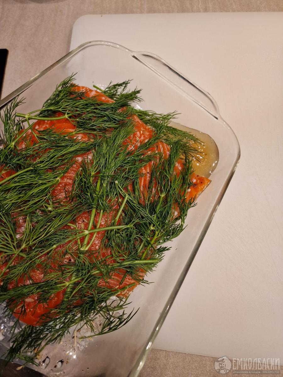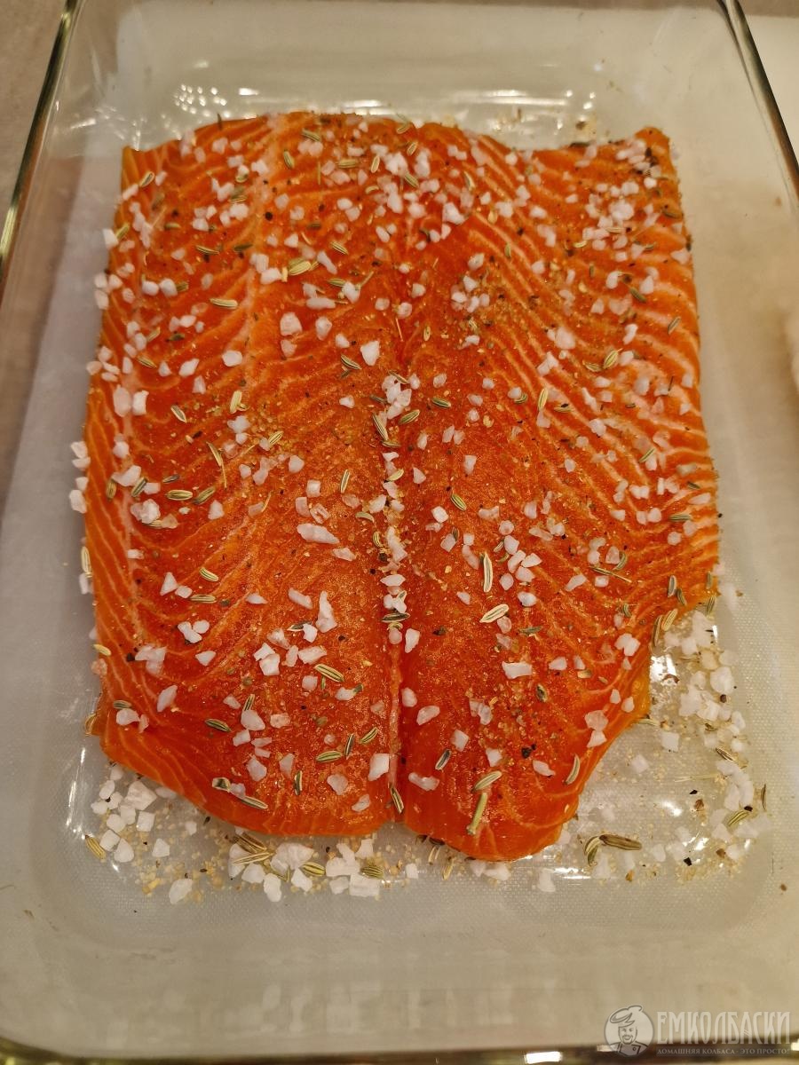 - очень важный этап - после того как очистили филе от соли и специй, промокните салфетками и, завернув в пищевую пленку, дайте полежать в холодильнике 12 часов - это нужно чтобы соль равномерно распределилась по куску