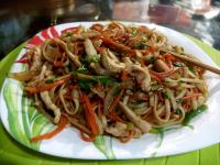 Добавляем оставшееся масло в сковородку, кладем лук, все время мешая. Через минуту добавляем морковь, продолжаем мешать. Следом чеснок и имбирь. Активно мешаем. Огонь выше среднего, не ждем готовности, просто все прогреваем, не жаря и не туша! Дальше перец. Буквально через 2-3мин кладем отваренную лапшу. Продолжаем активно мешать. Добавляем половину соевого соуса. Перемешиваем постоянно. Кладем курицу и оставшийся соус. Все еще мешаем)))