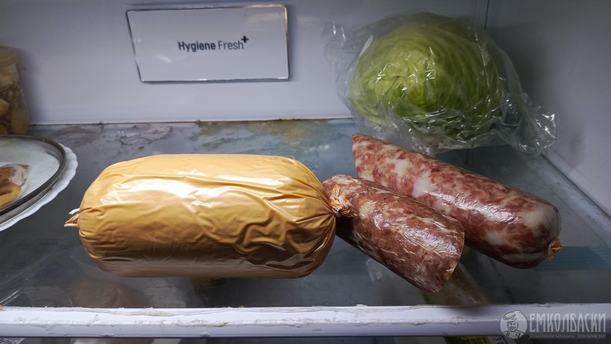 Делал сосиски свиные в полиамидной оболочке по рецепту. Сырьё — не очень жирная лопатка плюс 100 граммов сала на килограмм. Прокрутил 2 раза на мясорубке (2 мм). Взял только мясной фарш, добавил в него нитритную соль и фосфат (4 грамма на килограмм), влил ледяную воду (100 мл/кг). Перемешивал 14 минут, белые нити, монолитный фарш, все дела. Добавил сало, перемешивал ещё 5 минут. Убрал в холодильник на сутки.