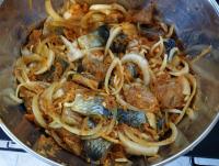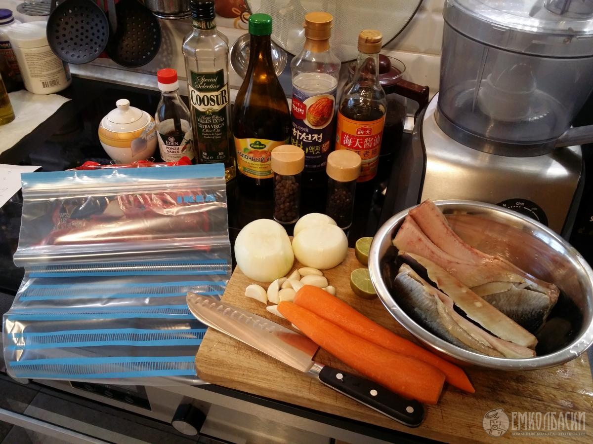 Лук режем полукольцами, морковь соломкой (как на плов), чеснок пластинками, рыбу на порционные кусочки которые будет удобно брать вилкой, все это кладем в ёмкость или как я в плотный пакет с зиплоком. Тщательно перемешиваем и убираем в холодильник. Через 1-2 дня закуска готова.