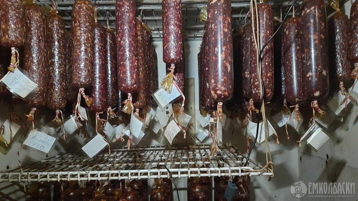 Фарш набивается в оболочку Мембрин калибром 40-45, ферментируется и батон вешается в климатическую камеру. Через 2 недели имеем такой результат.