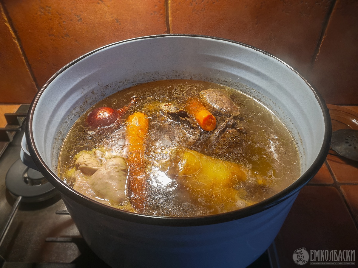Одну часть уже сварил в скороварке, а другая часть ещё томится в кастрюле. Всё одинаково по мясу и специям.