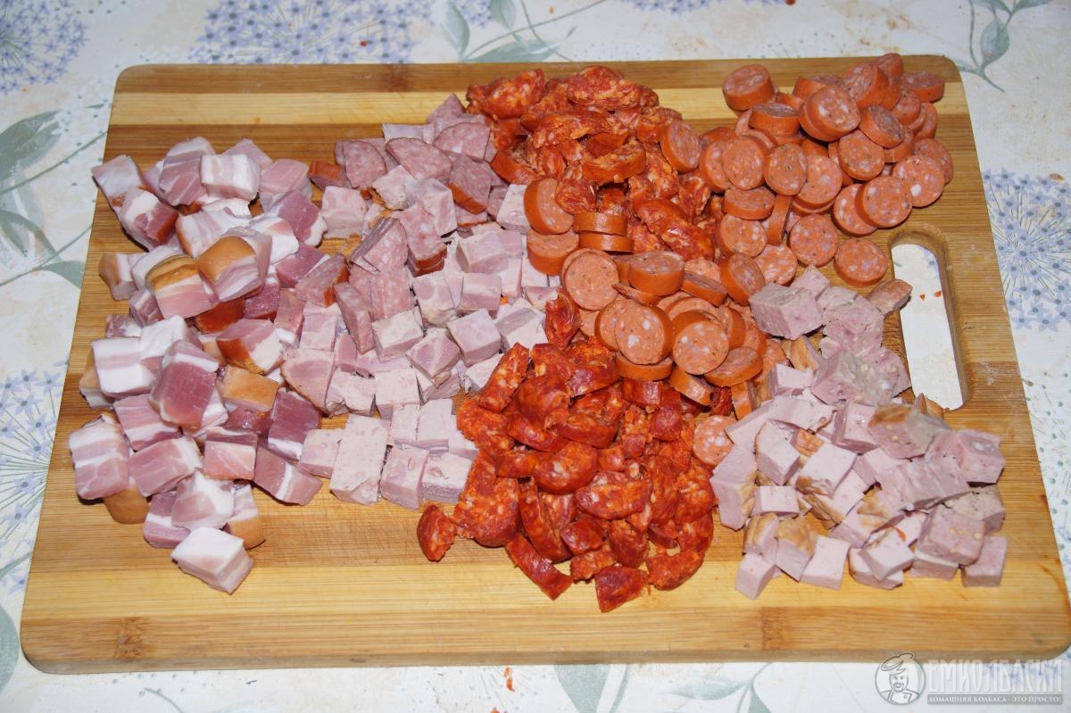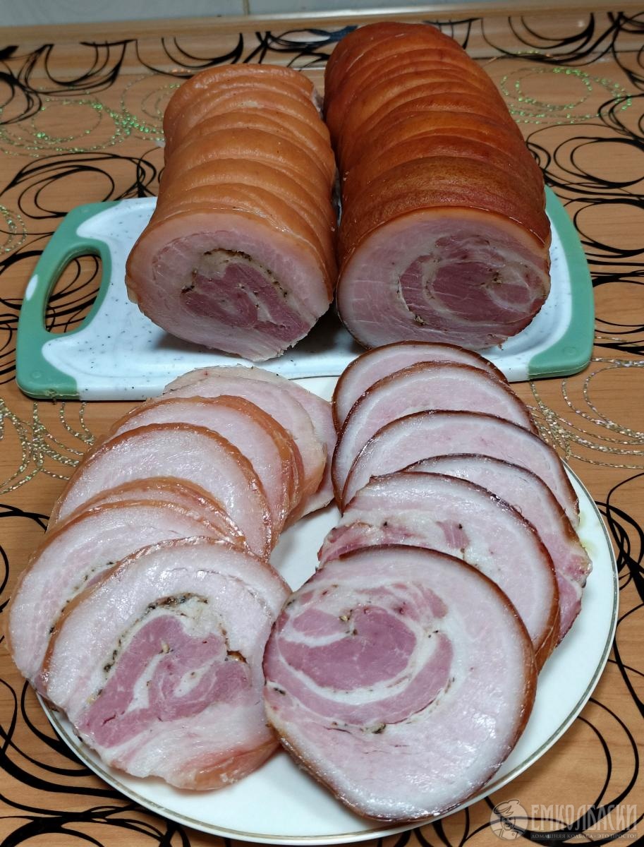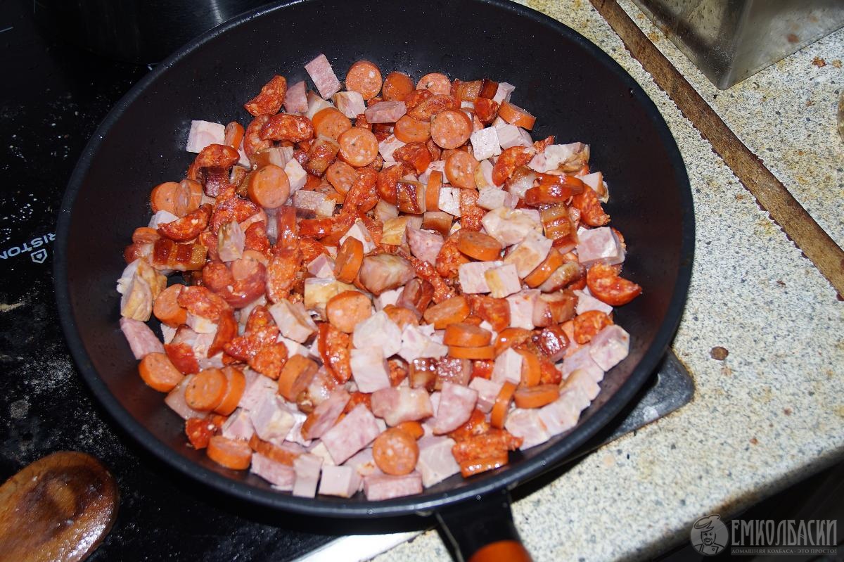 Грудинка копчёная и колбаски все были вожарены.