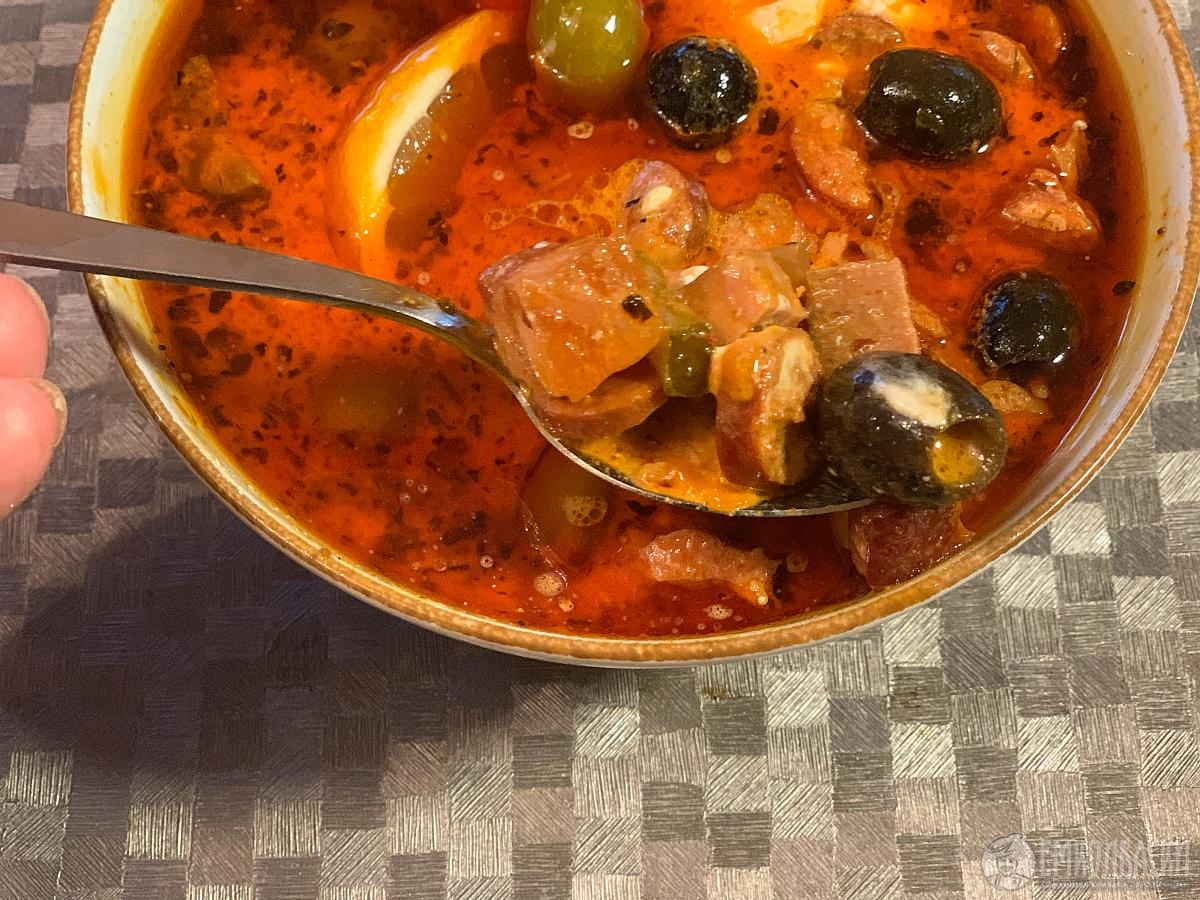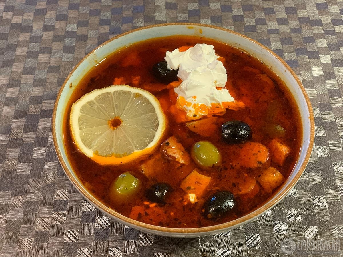 Да почему же они у тебя все какие-то не доделанные. Солянка - оливки тебе трудно было порезать? А лимона целая долька куда? Там половинки или даже четвертинки за глаза хватает. Где охотничьи колбаски?