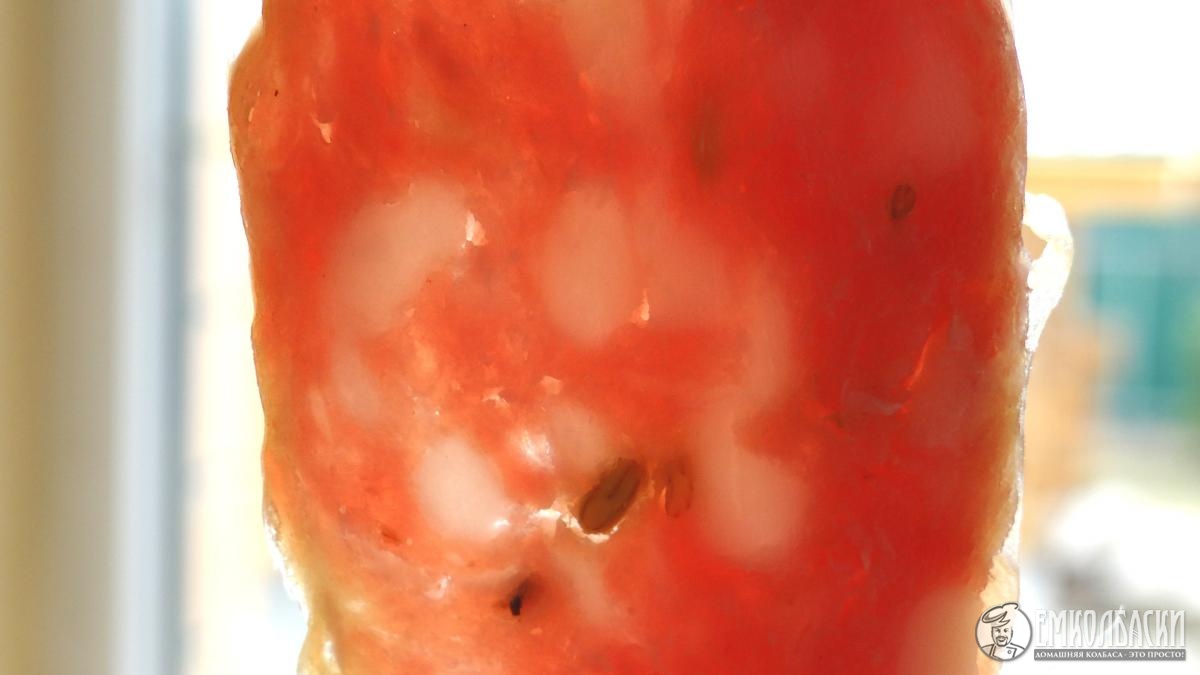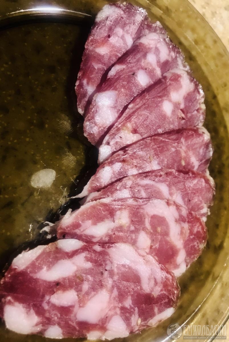 Прочитав комментарии автора к рецепту, что лучше использовать более постное сырье, первую партию салями решил изготовить из свиного окорока (без видимого жира) и шпика в соотношении 90% к 10% соответственно. Колбаса завялилась за 21 день с потерей веса 30%. Думаю, что такое быстрое вяление обеспечено постным сырьем в результате чего усушка пошла быстрее. По цвету получилась довольно светлой по сравнению с другими сыровяленными колбасами (к сожалению фото не сделал, а оставшуюся колбасу отправил в вакуум на созревание на месяц). По текстуре довольно плотная, напоминающая сыровяленное цельномышечное изделие. Вкус с выраженной кислинкой, ярко выражены фенхель и черный перец. Оболочку использовал коллагеновую 45 мм. В процессе вяления поверхность оболочки стала покрываться белой плесенью и оболочка стала отслаиваться от батона колбасы. Хочу отметить, что в моем случае использование коллагеновой оболочки в 90% случаев образует на поверхности белую плесень. На качестве колбасы это никак не сказывается: нет ни постороннего запаха, ни липкой поверхности, ни постороннего привкуса. С другими оболочками при тех же условиях плесень не образуется.