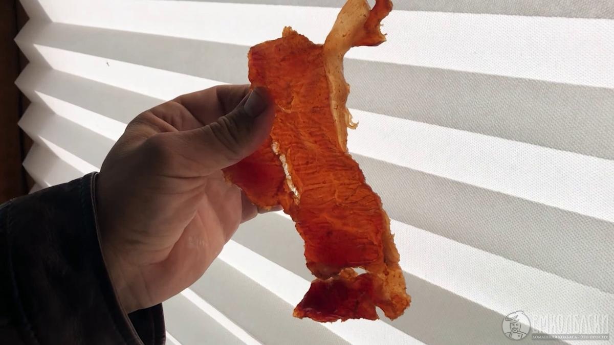«Сушить» чипсы можно в сушилке для овощей или в духовке при температуре 65...70 град. и тогда они получатся вареными. А в коптильном шкафу с конвекцией чипсы можно сделать классическими сырокопчеными. В этом случае термообработку проводить при 45...48 град. в течении 10...12 час. в коптильном шкафу. В процессе можно ароматизировать дымом (коптить) по желанию. Длительность копчения зависит от устройства дымогенератора. Например, лабиринтным дымогенератором можно коптить все 12 час., а эжекционным дымогенератором «сапогового» типа достаточно 2...3 час. Интенсивность цвета копчености на ваш вкус.
