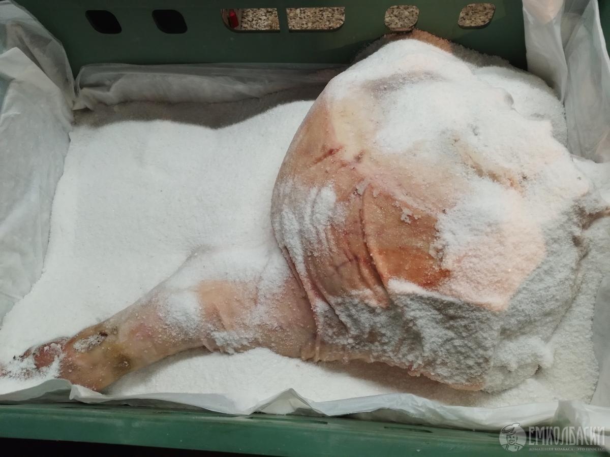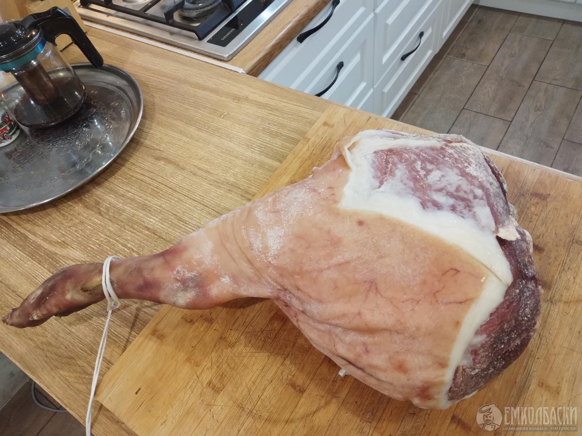 Мой первый опыт.Почитала комментарии и что то страхово мне стало за свой хамон первый раз делала,год будет в ноябре(как раз у мужа день рождение)будем пробовать.Солила 20 дней(10 кг нога),я читала что сутки на каждый кг,но у Павла вроде дольше.Натирала открытые участки без кожи натёрла на инста солью,пару часов дождалась  реакции с мясом,потом в соль закопала,предварительно постелила одноразовую пелёнку для влаги.20 дней,помыла и повесила вялиться.Термокамеры нет,но частный дом и помещение где копчу и колбаски делаю,думаю,ну уж прохладное место найду.,до весны проблем не было,висит и висит,и всё лето я эту ногу "пасла",предварительно обмазала салом с рисовой мукой.Потом я решила отгонять мух от неё,чтобы не дай Бог не сели,была у меня специя 1 кг вонючая готовая смесь  типа карри,не люблю,подумала мухам тоже не понравится,обсыпала и натёрла,потом мне показалось вот в погребе должно ей быть комфортно,повесила,через сутки смотрю"шуба белая на ней"я опять вытаскиваю и снова обсыпаю специями и в сохнет,потом слишком жарко,сало начало топиться,я опять обсыпаю перцем и в сушильно вялочную камеру на сутки.Сейчас мои танцы кончились,и она просто висит страшная от перца.Муж ужасается,говорю будет красивая,когда помою. Главное не протухла,уже хорошо!И сохнет. в конце ноября покажу в разрезе.Первое фото через 20 дней посола и 10 дней сушилось.