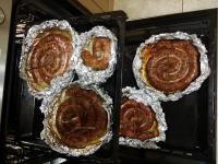 Остальную колбасу просто запёк в духовке в течение такого же времени при тех же параметрах (запекал одновременно с вышеупомянутой колбасой). Череву не штриковал, обошлось без разрывов. Потеря в весе составила 27%.