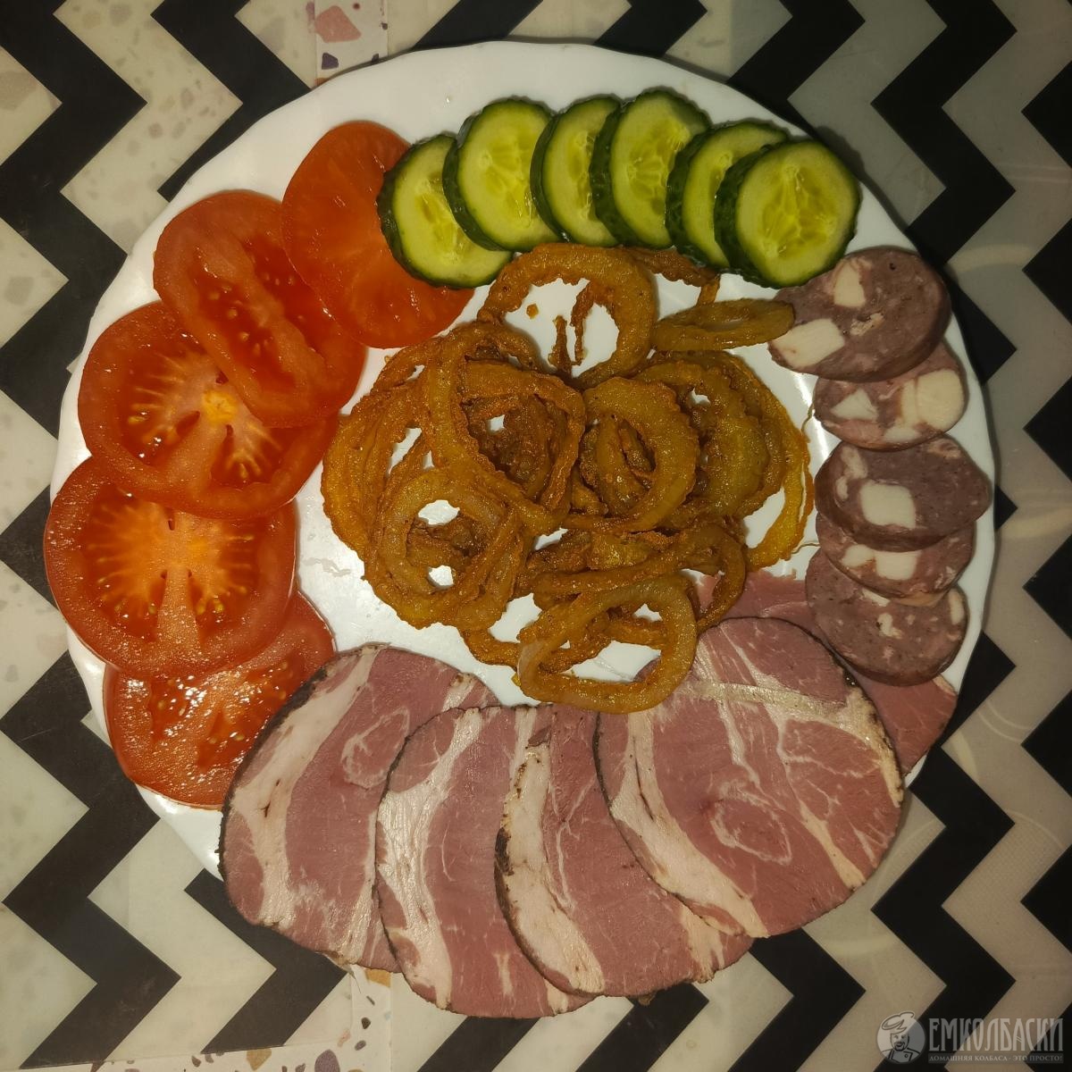 Немножко поужинаем. Ветчина из шейки, Краковская. Свежий помидор и малосольный огурчик. Пиво в кадр не попало.