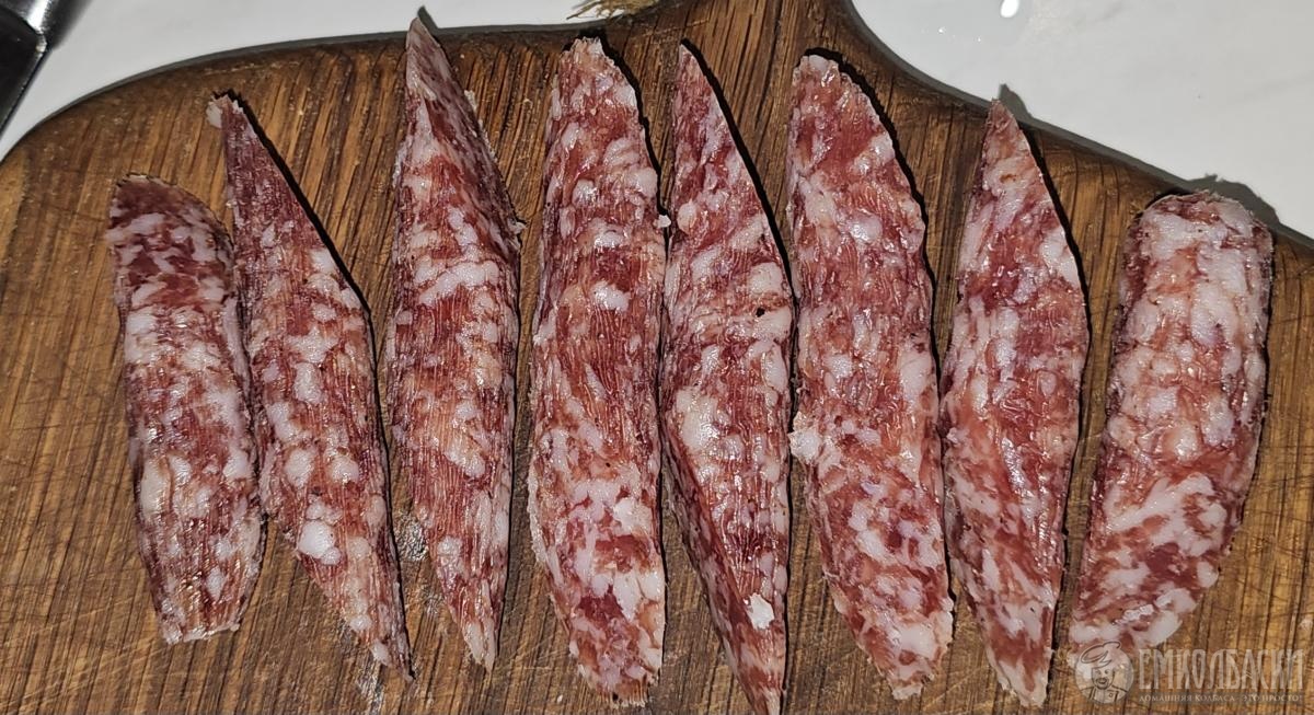 Чуть мало соли и специй, нитритки клал 1,7гр на кг. Слабый вкус сыровяленой колбасы